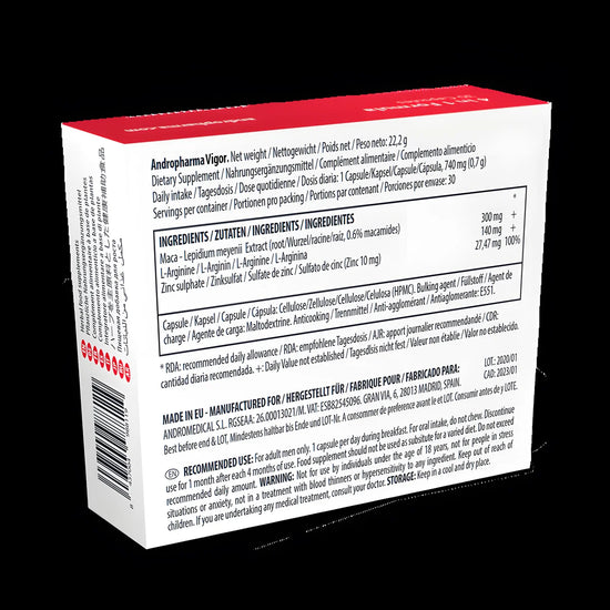 Le complément Andropharma Vigor permet d'augmenter la libido et de stimuler le désir sexuel des hommes. Divers ingrédients comme la maca, la damiana et le zinc favorisent la production de testostérone ou l'activité de cette hormone et donnent de la force à tout l'organisme. La testostérone est un élément clé du développement sexuel de l'homme. Il stimule également la maturation des spermatozoïdes et influence les caractéristiques du sperme, telles que la motilité.