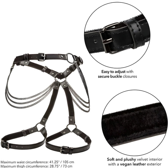 Augmentez le plaisir avec le Harnais de Cuisse Multi Chaînes de la Collection Euphoria : un accessoire premium pour des désirs intensifiés. Idéal pour les moments intimes ou pour ajouter un style festival, ce harnais de cuisse fait une déclaration audacieuse. Les sangles réglables à la taille et aux cuisses assurent un ajustement confortable avec une fermeture à boucle. Le design contemporain améliore la durabilité et la satisfaction globale. Profitez de la sensation luxueuse de l'intérieur en velours doux et de la sophistication de l'extérieur en cuir végétalien. La construction robuste, avec double rembourrage et coutures, assure le confort lors des rencontres passionnées. Les accents métalliques qui ne ternissent pas ajoutent du glamour, créant un attrait visuel époustouflant. La conception polyvalente s'adapte à la plupart des tailles. Libérez vos envies avec le harnais de cuisse multi-chaînes de la collection Euphoria.