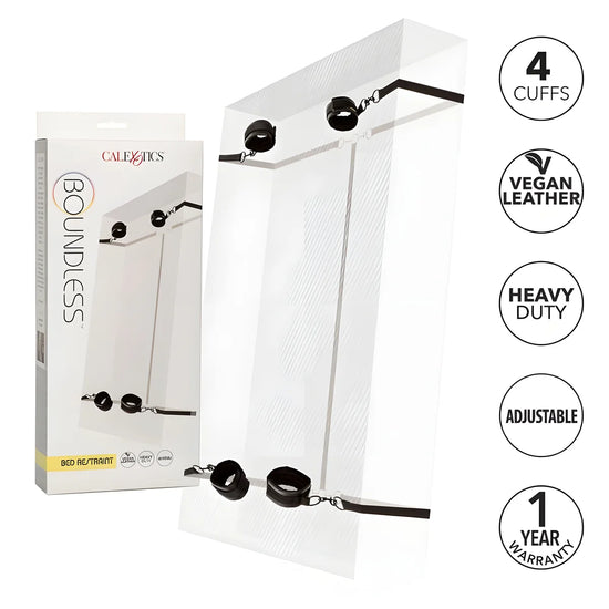Attention : le système de retenue de lit Boundless risque d'encombrer vos soirées pendant longtemps ! Ce jouet pour adulte est livré avec des poignets et des chevilles dotés de fermetures de style velcro et de fermoirs universels, garantissant un maximum de confort et de retenue.