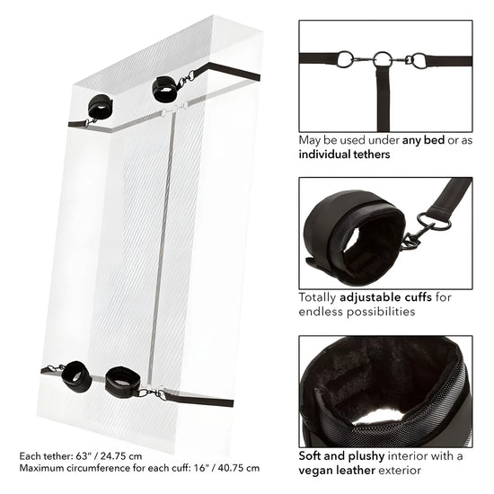 - 4 poignets ou chevilles totalement réglables et détachables | 4 attaches robustes et réglables pour s'adapter à la plupart des matelas | Peut être utilisé sous n'importe quel lit ou comme attaches individuelles | Fermoirs universels et joints toriques avec conception pivotante pour une dextérité totale | Intérieur doux et moelleux avec un extérieur en cuir végétalien | Double rembourrage, double couture | Design fonctionnel, durable et texturé