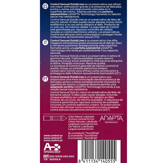- Control Sensual Dots & Lines est un préservatif en latex de caoutchouc naturel.