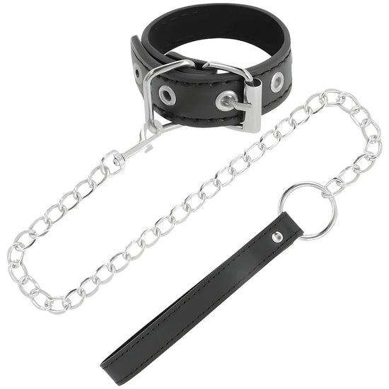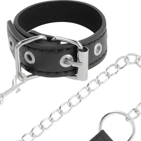 Dispositif de retenue pour la base du pénis, il est adaptable et possède une chaîne en métal pour que vous puissiez emmener votre partenaire où vous le souhaitez, ou pour qu'il vous emmène, une pratique de soumission BDSM.