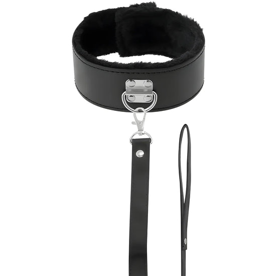 La solide chaîne noire est attachée à l'aide d'un fermoir mousqueton à un anneau sécurisé sur le collier et est associée à une poignée confortable.
