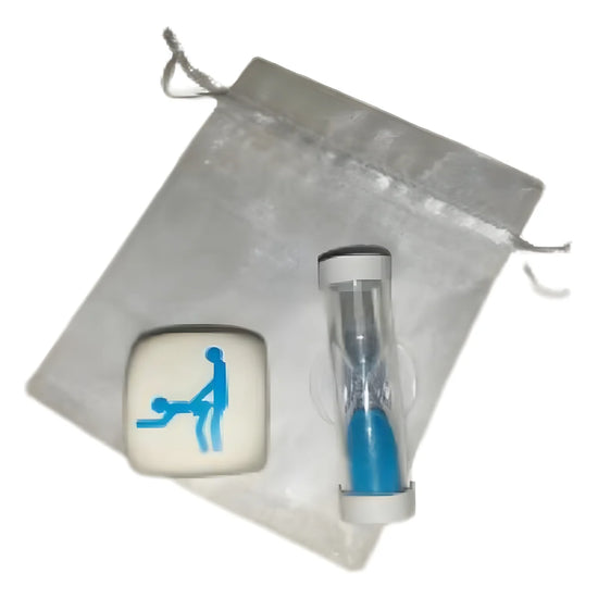 DÉS BLANCS DUR DE HAUTE QUALITÉ DE 25 mm ET UN SABLIER DE 2 MINUTES qui marqueront le temps de la POSTURE qui sort. Ils sont dans un sac en soie transparente.