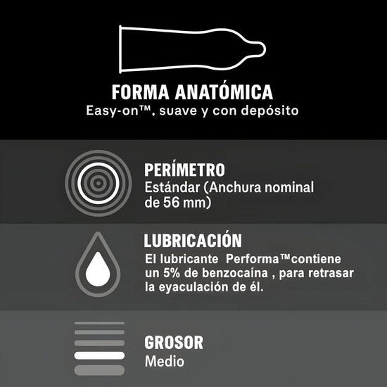 - Contient du lubrifiant Performa à 5% de benzocaïne qui retarde l'éjaculation