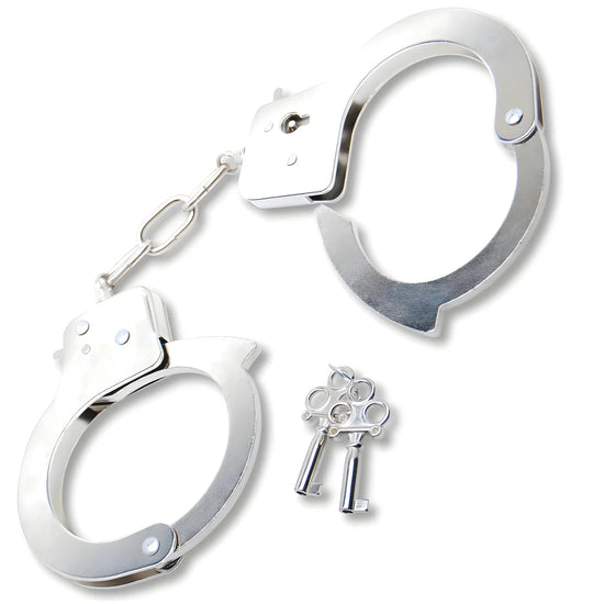 Sortez ces menottes lorsqu'il est temps de commettre quelques violations en mouvement. Fabriqués en acier nickelé, ils sont l'accessoire parfait pour ce costume de flic coquin - ou tout simplement une excellente excuse pour faire prisonnier votre amant. Livré avec deux clés interchangeables.