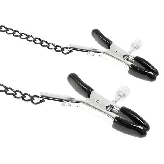 Fabriqué à partir de cuir végétalien souple et doté de deux pinces à tétons à maillons de chaîne, cet ensemble de colliers de serrage sécurise votre sujet en un rien de temps. Le bâillon confortable s'ajuste facilement à presque toutes les tailles, tandis que les pinces à tétons vous offrent la bonne tension au bon endroit. Ajustez simplement la vis aux tétons jusqu'à ce qu'elle soit serrée et confortable et commencez à profiter du plaisir d'un bon pincement. Leurs revêtements en caoutchouc leur permettront de ne pas glisser et de rester en place sous l'action du moment.