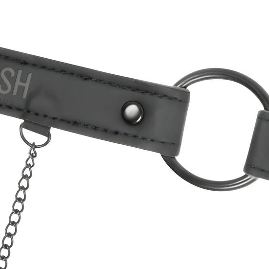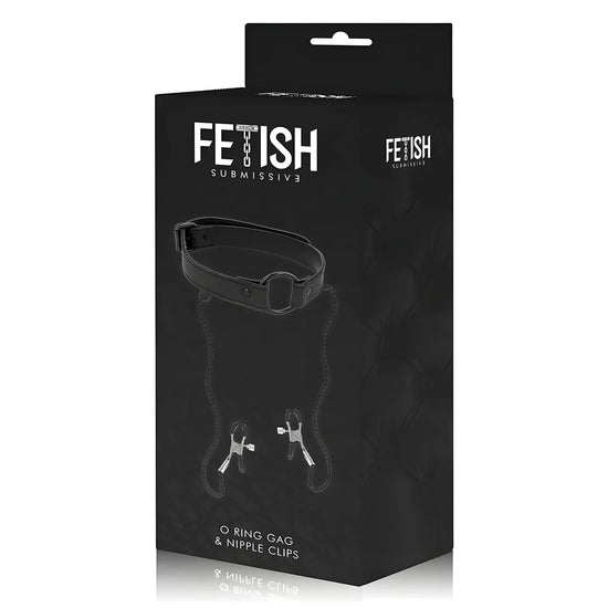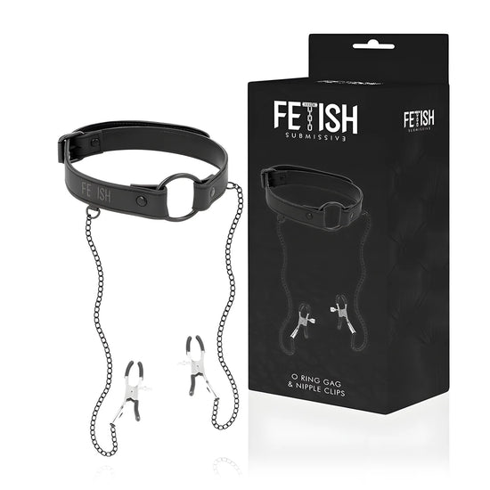 Gag FETISH SUBMISIVE avec anneau en cuir vegan avec pince à téton attachée par chaîne en métal. (Anneau en PVC)
