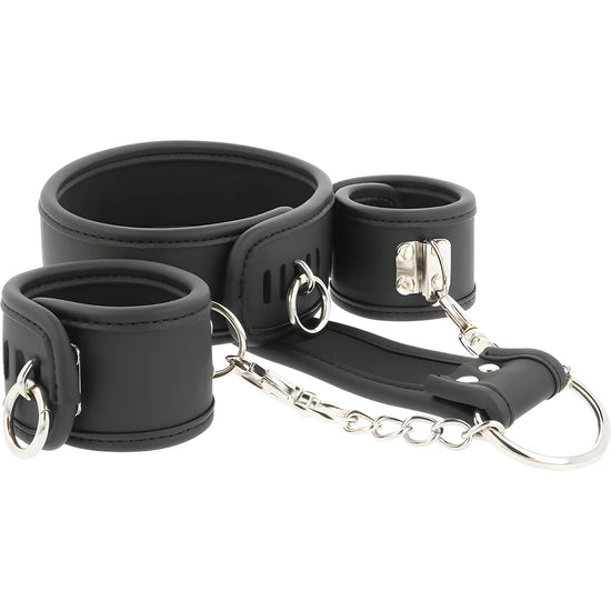 Ces menottes ont l'esthétique élégante que vous recherchez ainsi qu'une efficacité absolue. Double épaisseur et fini avec une boucle en métal, votre soumis ne pourra pas s'échapper. L'intérieur rembourré garantit qu'ils resteront à l'aise, peu importe combien ils tirent ou combien de temps ils jouent. L'ensemble dispose d'une chaîne de liaison pour immobiliser du cou jusqu'aux mains.