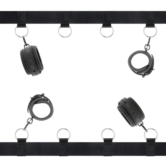 Prenez le contrôle de votre amoureux avec cette parure de lit complète ! Ces menottes vous permettent de créer une soumission totale de votre amoureux au lit, en cuir vegan très résistant et en métal sans nickel. Avec cet ensemble, vous pouvez transformer le lit en un lieu BDSM.