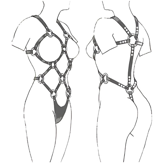 Pratiquez le BDSM avec ce harnais en cuir pour femme, entièrement lié de haut en bas et 100% réglable.