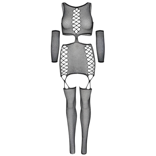 Robe porte-jarretelles 2 pièces à faux lacets et découpes en filet avec bas cousus au dos et gants assortis de la prestigieuse marque de lingerie Leg Avenue. Augmentez votre féminité en obtenant une pièce exclusive de séduction, de sensualité et d'élégance.