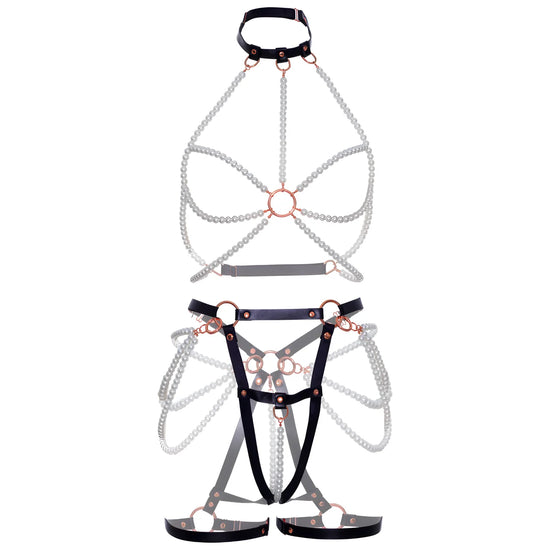 Rehaussez votre charme avec notre harnais licou 2 pièces, orné de fausses perles et d'une pièce maîtresse à joint torique. Fabriqué à partir de cuir végétalien éthique, il est à la fois tendance et adaptable. Le style convertible vous offre la possibilité de le porter avec ou sans la culotte amovible, mettant en valeur de séduisants brins de perles. Laissez briller votre grâce intérieure et adoptez une touche de raffinement à chaque occasion.