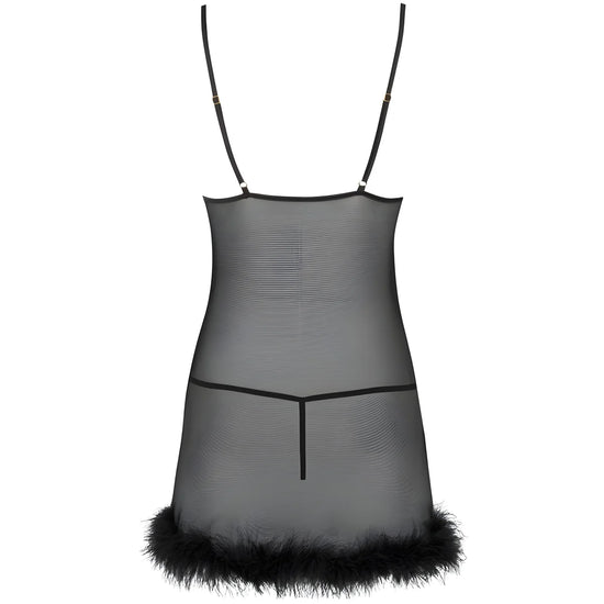 Zerunam est un produit composé d'un mélange de polyamide et d'élasthanne, une matière très douce et agréable au toucher qui s'adapte bien au corps. La chemise ne gratte pas la peau, ne restreint pas les mouvements et garantit un confort d'utilisation total. L'ensemble s'adapte aux formes de la silhouette, mais n'est pas serré. Koszula atteint derrière la ligne des cuisses, en soulignant les fesses. La finition noire sophistiquée de la canette donne à l’ensemble un aspect extrêmement coquet.