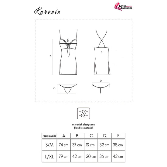 Karonin Dubarry Collection est un ensemble composé d'une chemise de nuit sensuelle et d'un string noir assorti. L'ensemble est réalisé en dentelle douce et ajourée et est en outre décoré d'un subtil ruban rose poudré noué au niveau du buste. Une telle combinaison contrastée de rose doux et de noir féroce donne à la tenue du courage et de la confiance en soi. À son tour, le matériau de l'ensemble garantit que son utilisateur se sente le mieux possible dans son corps. La dentelle est en polyamide agréable au toucher, qui ne gratte pas et s'adapte bien à la forme de la silhouette féminine.