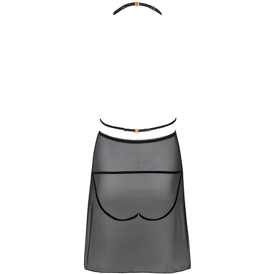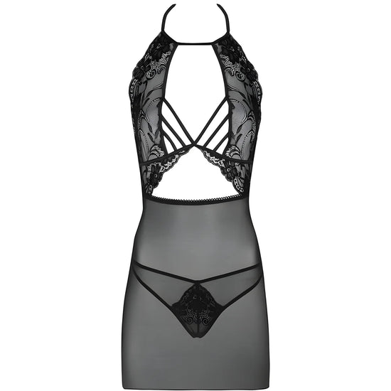 Le T-shirt de l'ensemble Malviami est une combinaison impressionnante de matières classiques, avec des bretelles sensuelles et prédatrices soutenant le buste et ajoutant du caractère. La partie supérieure de la tenue est en dentelle féminine et la partie inférieure est en maille dense, arrivant jusqu'à mi-cuisse. La chemise est décolletée aussi bien devant que derrière. Sous la matière semi-transparente, on aperçoit un string à la coupe originale avec un empiècement en dentelle et des bretelles entourant les fesses. Grâce à la couleur noire classique, l'ensemble sera parfait en toute occasion et contribuera à masquer les imperfections mineures de la silhouette, tout en soulignant ses avantages.