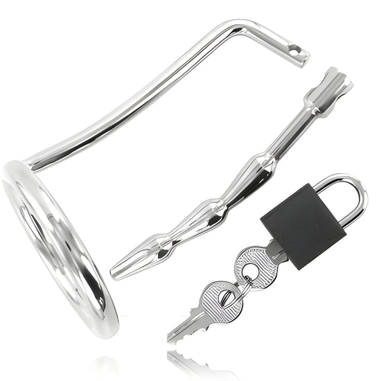 Découvrez votre côté le plus Bdsm ! Placez l'anneau sur la base des testicules et insérez le bouchon métallique sur l'urètre du pénis, placez le cadenas et... l'action commence ! interdit d'avoir des érections.