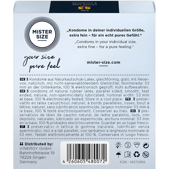 MISTER SIZE vous offre une toute nouvelle sensation lors des rapports sexuels tout en offrant une sécurité optimale. Tous nos préservatifs MISTER SIZE sont conformes à la norme DIN EN ISO 4074:2002 et sont soumis à des tests approfondis. Avoir un préservatif avec une sécurité optimale génère une confiance et une sécurité qui permettent aux deux partenaires de se détendre et de se laisser aller complètement pendant l'acte sexuel.