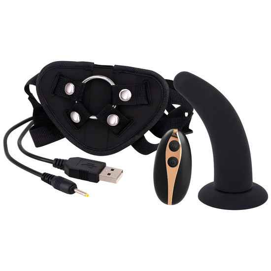 Harnais à sangle avec gode vibrant de 17,8 cm Télécommande. Le vibromasseur est équipé d'une puissante ventouse afin qu'il puisse adhérer fermement aux surfaces planes