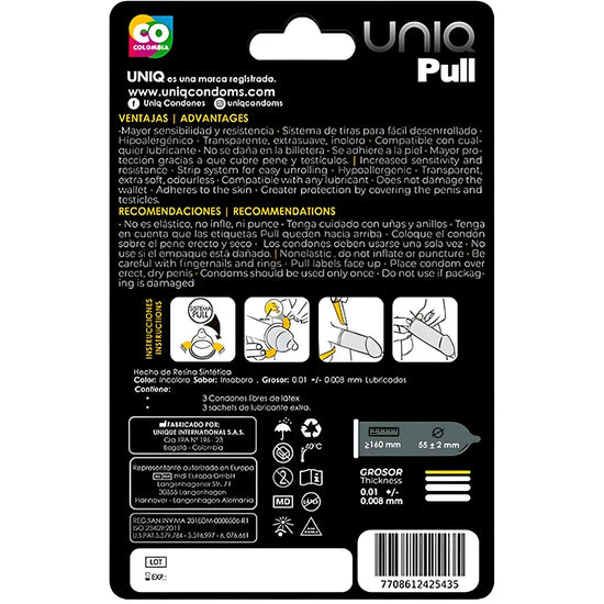 Uniq Pull se distingue des autres types de préservatifs par son système unique de bandes. Il suffit de placer le préservatif à l'extrémité du pénis en érection et de tirer les bandes vers le bas pour une couverture complète. Une solution simple et rapide pour des rapports sexuels protégés !